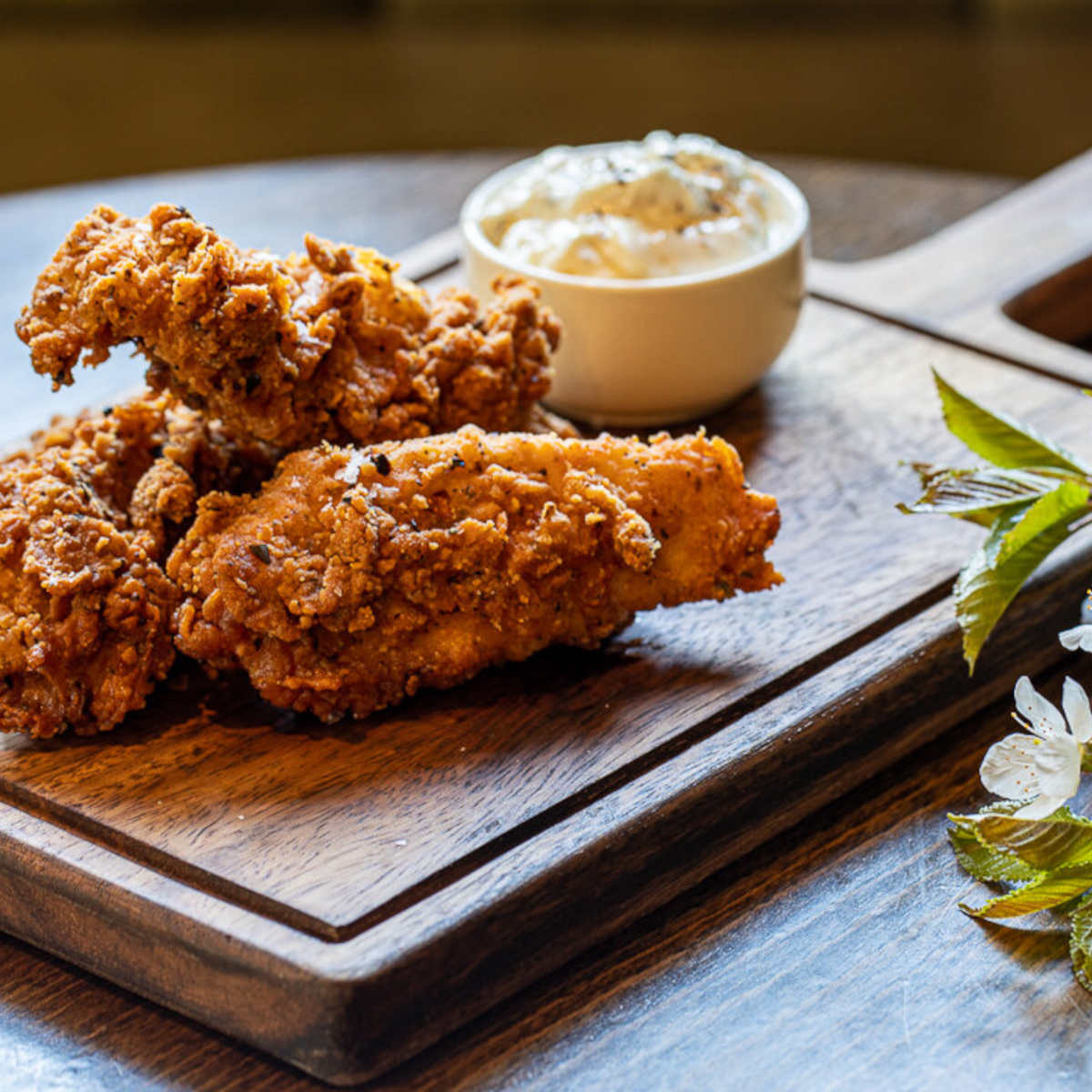 Southern-fried chicken strips, garlic mayo | 7.5 739 kcals