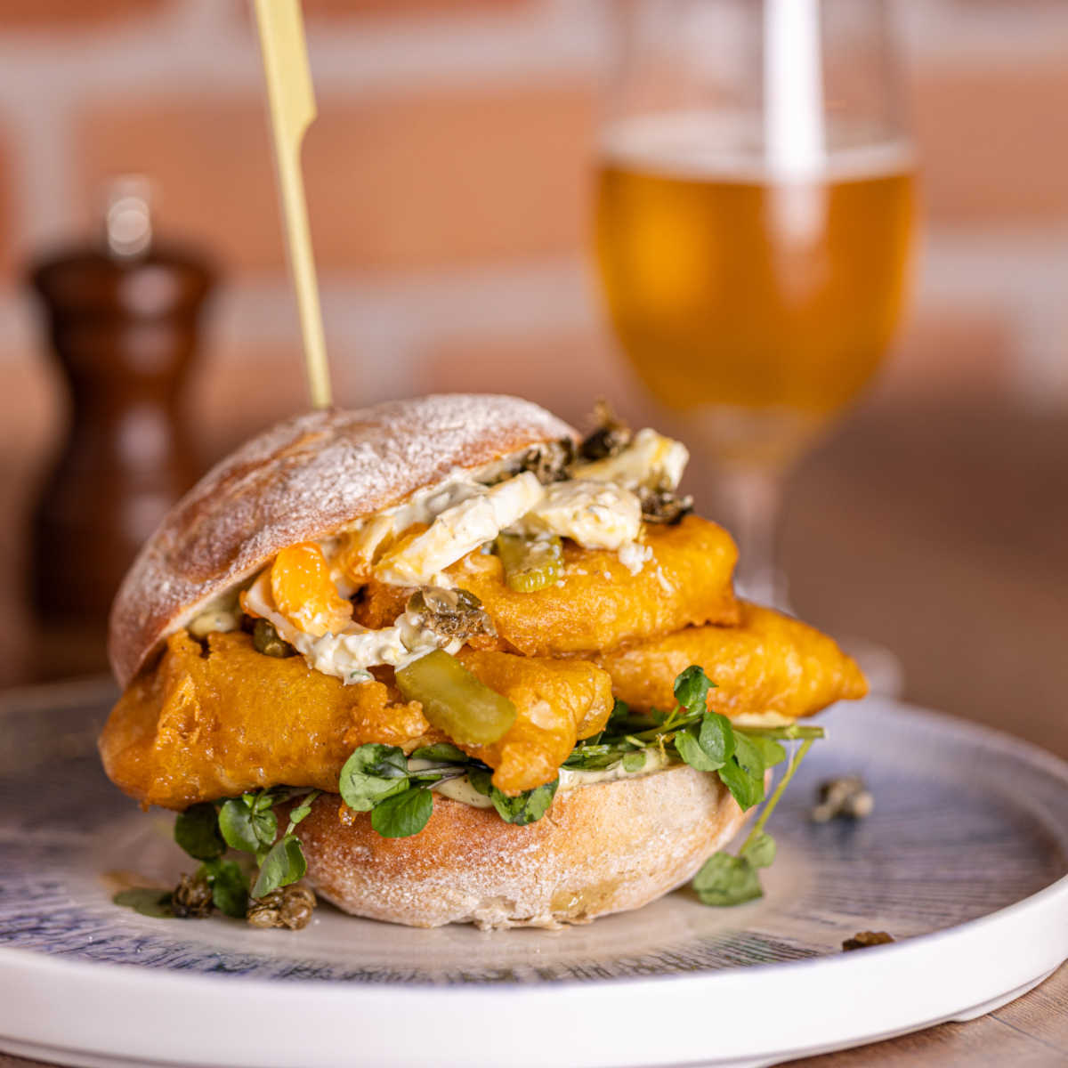 Oh Capi-tan - Fish-finger sandwich, dill mayo, chopped egg, pickles, fried capers, sourdough bun 539 kcals