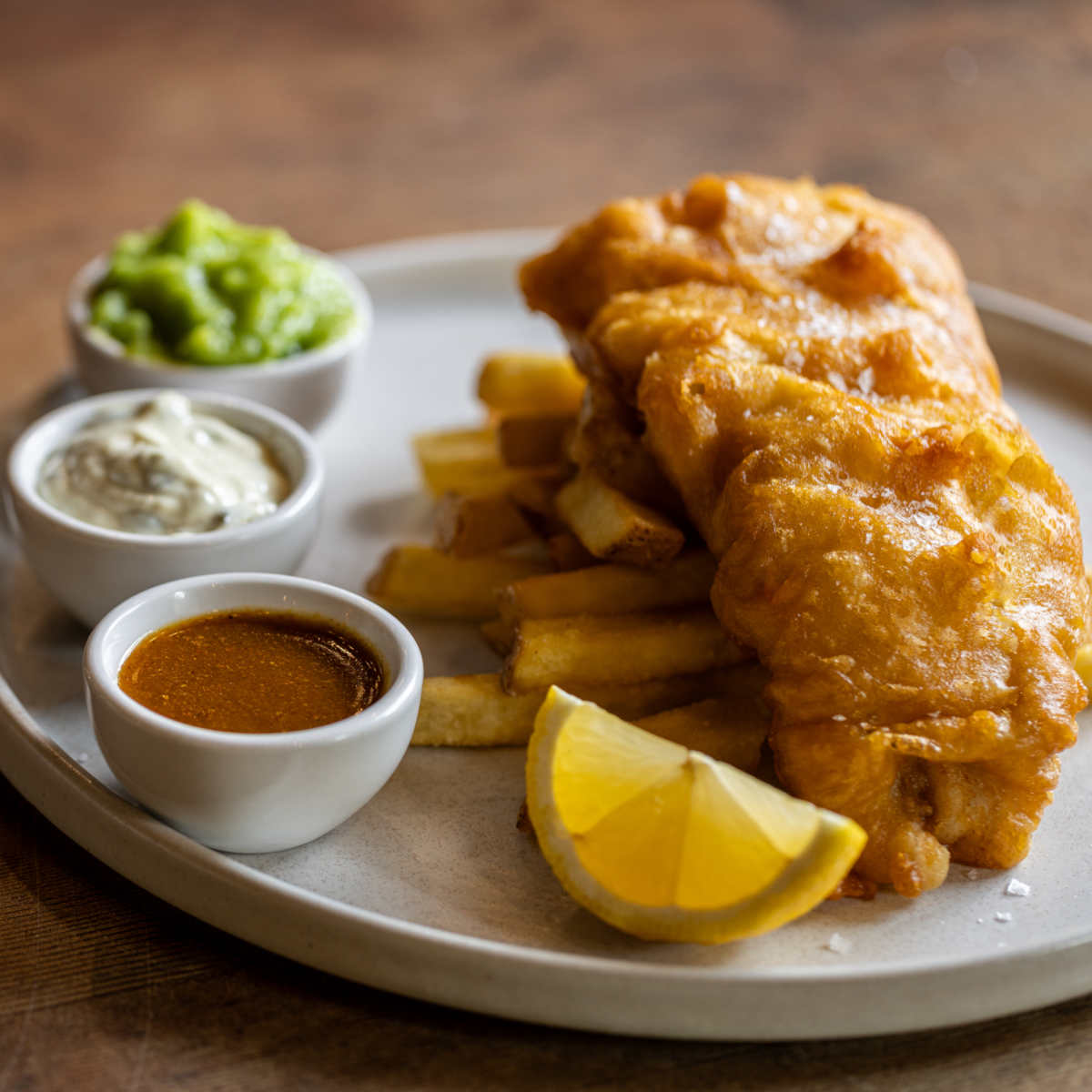 Beer-battered fish & chips, minted mushy peas, homemade tartare, curry sauce | 19 1657 kcals