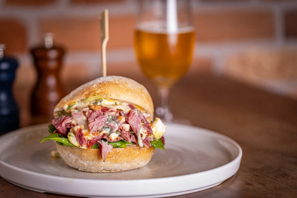 The Hogarth - Pulled ham hock, hot honey, green apple, watercress, egg mayo, sourdough bun | 12.5 405 kcals