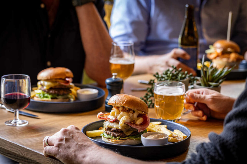 Blacksticks blue cheese, double beef burger, bacon, caramelised red onion, peppercorn mayo, skin-on chips | 19.5 1328 kcals
