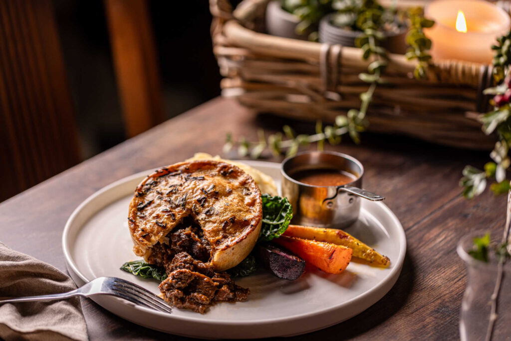 Wild mushroom bourguignon pie, seasonal greens, roasted roots, gravy (ve) | 18 1049 kcals